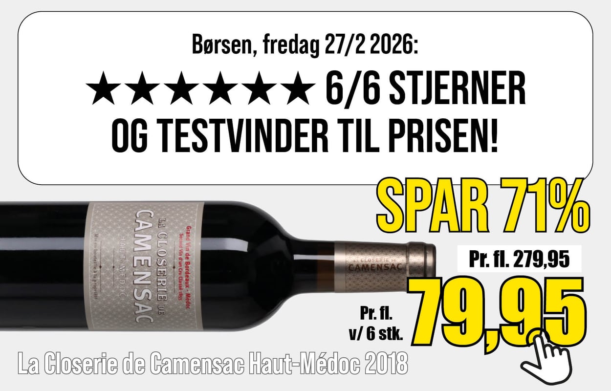 Vi tilbyder Danmarks mest udsøgte udvalg af vin til markedets skarpeste priser. Hos os får du altid super service samt hurtig og sikker levering fra dag til dag.