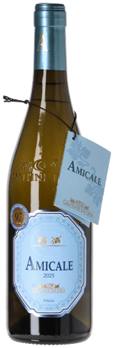 Amicale Bianco 2025 præsenterer sig klar med et vibrerende citrusgrønt skær… Næsen er vidunderlig intens med de lifligste aromaer af hybenrose, litchi, pære, abrikos og tropiske frugtnoter, som løftes med et krydret touch af vanilje fra de franske fade… I munden fed og blød. Smagen er lækker afbalanceret og letkrydret. En fremragende norditaliensk hvidvin! Hverken knastør eller halvsød - men lige i det behagelige smagspektrum mellem det tørre og det søde. Til prisen et perfekt alternativ til langt dyrere hvidvine fra Tyskland og Alsace! Drik nu, eller gem 4-5 år fra høståret.