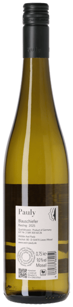 Axel Paulys mineralske Blauschiefer 2025 er skabt på 100 % Riesling, som vinbonden selekterer fra stejle vinmarker med høj koncentration af Mosels berømte blåskifer i jordbunden. Efter nogle timers koldmacerering spontangærer hvidvinen på ståltank med vinmarkens naturligt forekommende gær. Efter endt gæring modner vinen nogle måneder på de fine gærresterne, som føjer cremet tekstur og mineralsk finesse til smagsoplevelsen. Vinen er fremstillet i en halvtør stil med 28,0 gram restsukker pr. liter