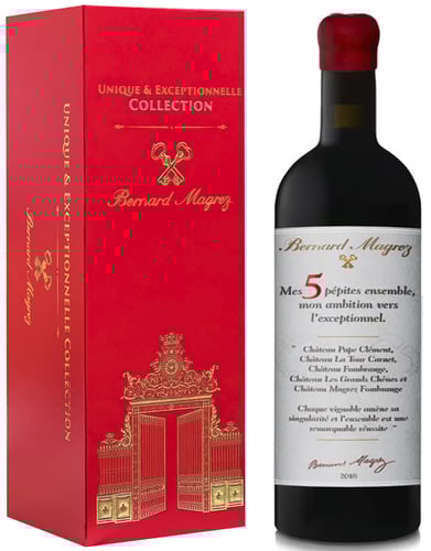 ”My ambition for the exceptional ... Crafted from the blend of five jewels of our wine heritage – Château Pape Clément, La Tour Carnet, Fombrauge, Les Grands Chênes, and Magrez Fombrauge – it reflects the perfect union of five unique terroirs, where each vineyard contributes its own singularity." - Bernard Magrez