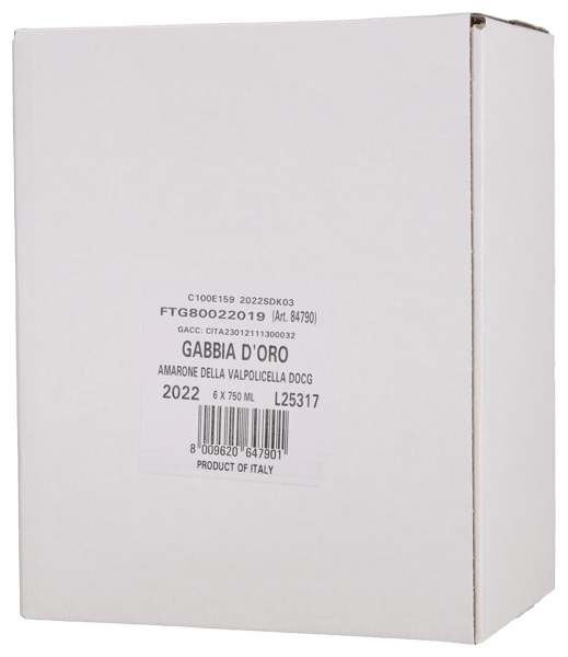 Gabbia d’Oro Amarone della Valpolicella DOCG 2022 er fremstillet på et klassisk blend af Corvina, Corvinone og Rondinella, der håndplukkes fra udvalgte parceller i Valpolicella. Druerne tørres over flere måneder på hylder i særligt ventilede tørrerum, hvor temperaturen og luftfugtigheden holdes konstant, indtil druerne smider 35 % af deres oprindelige vægt. Fordampningen koncentrerer alle aromaer, smagsstoffer og sukkerindholdet, så rødvinen efter endt gæring og modning byder på et ekstra niveau af alkhohol, frugtpower og smagslængde.
