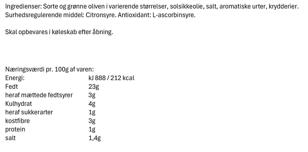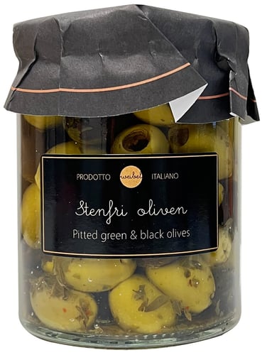 Stenfrie sorte og grønne oliven og aromatiske urter.