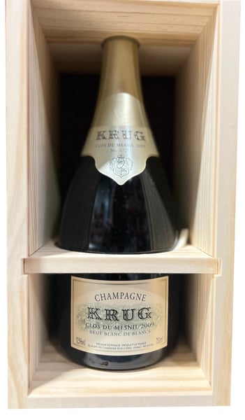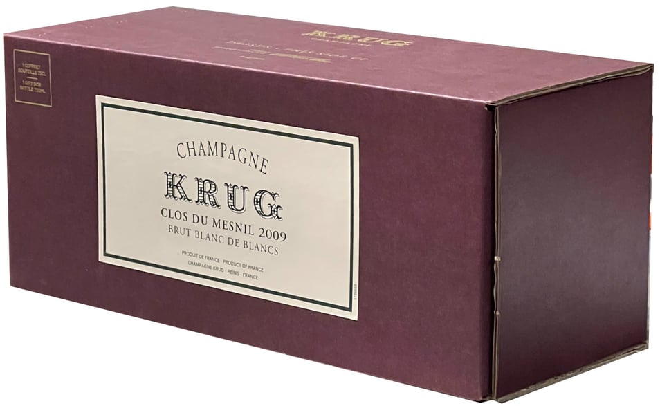 Krug Clos du Mesnil 2009 er en legendarisk Blanc de Blancs fremstillet på 100 % Chardonnay, der håndplukkes som hele klaser over fem til seks høstrunder fra en 1,84 hektar lille, muromkranset mark neden for landsbykirken i Le Mesnil-sur-Oger. Druemosten er vinificeret på egetræsfade uden malolatisk gæring. Efter andengæringen på flaske modner vinen følger omkring 12 års modning på gærresterne frem mod degorgeringen.