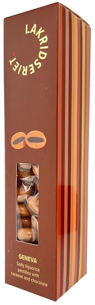 Lakridseriet Geneva salmiakpastil med karamelchokolade