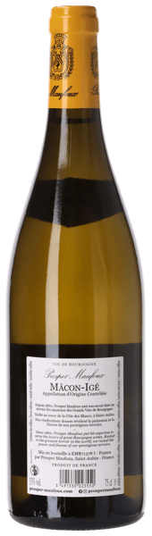 Vinen er fremstillet på 100% Chardonnay, som Prosper Maufoux håndhøster fra kalkholdige top-terroirs i Mâcon-Villages-kommunen Igé, der ligger lidt nord for berømte Pouilly-Fuissé. Umiddelbart efter høsten presses de hele klaser i en skånsom pneumatisk vinpresse, så kun den mest delikate druemost finder vej til den færdige vin. Mostklaring i 24 timer ved 12°C. Herefter gærer og modner hvidvinen 12 måneder på ståltank og 228 liters egetræsfade, heraf 10 % nye. Prosper Maufoux rister kun sine egetræsfade let, så fadkrydderierne holdes ekstra fine og delikate.