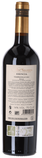 Esencia 2012 er lavet på 100 % Tempranillo, der plukkes fra 4 af de fineste og højst beliggende plots i byen Labastida (La Cabaña (1964), El Bosque (1975), Espribel og Marrate (1997), der ligger mellem floden Ebro og bjergkæden Sierra de Toloño i Rioja Alavesa. Fælles for de fire plots er, at de er nordvendte, så man sikrer sig en kølig elegance i den ellers meget varme region. I gennemsnit er Tempranillo-stokkene 60 år gamle og alle plots høstes enkeltvis alt efter, hvornår druerne er perfekt modne. Når druerne ankommer til vinereiet bliver de nænsomt knust og Macerationen/udblødningen af drueskallerne i mosten varer i fire dage for maksimalt udtræk af farve og smag. Herefter følger en nøje kontrolleret gæring under 28 °C. Vinen modner i bedste Rioja-stil i 18 måneder på 100 % nye amerikanske egetræsfade, der giver masser af krydderi og kompleksitet til den endelige vin. Efter fadmodningen flaskes vinen, hvorefter den modner minimum 12-14 måneder på flaske. Dette parti kommer direkte fra Rolland & Galarretas egne kældre, hvor topvinen altså har modnet til perfektion i næsten 13 år.