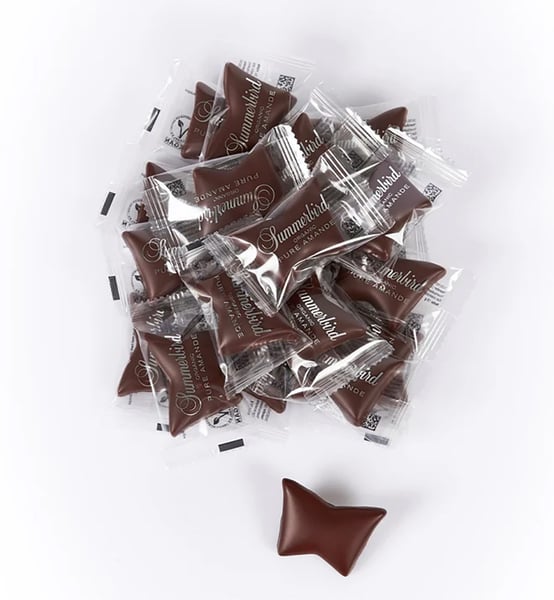 Opskriften på Summerbirden er enkel: ren marcipan af stenvalsede middelhavsmandler, overtrukket med mørk chokolade Amazonas 61 %. En perfekt kombination, hvor mandelsmagen og de fine florale noter i den saftige marcipan fremhæves af den frugtige mørke chokolade.