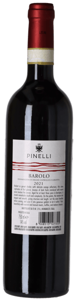 Pinelli Barolo 2021 præsenterer sig elegant kirsebærrød med et modnet skær af teglsten nær glassets kant… Duften er intens og kompleks med nuancer af tørrede roser, mørke kirsebær, tranebær, lakrids, kamfer og krydderier. Det hele indrammes elegant af mineralske toner af skovbund, et strejf af tjære samt subtile noter af kaffe fra den 36 måneder lange fadlagring... I munden tør og fyldig med forførende bæraromaer og en markant, karakterfuld tekstur. Den modne frugt spiller smukt sammen med faste, madvenlige tanniner, en frisk mineralitet og en urtekrydret dybde. En helstøbt og klassisk Barolo af fremragende kvalitet. Drik nu, eller gem +15 år fra høståret.