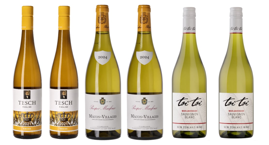 Dr. Martin Tesch fra Nahe med sin hæderkronede enkeltmarks-Riesling, Bourgogne-klassikeren Prosper Maufoux med deres uimodståelige Mâcon-Villages Chardonnay og oversøisk charme fra New Zealand, Toi Toi med deres Marlborough Sauvignon Blanc.