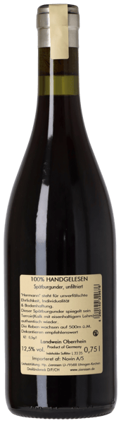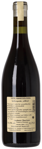 Jaspis Hermann er fremstillet på 100% Spätburgunder (Pinot Noir), der håndhøstes fra en særlig enkeltparcel med over 50 år gamle vinstokke på det 1,5 hektar store og kedelformede terroir Talrain, som vi finder omgivet af skov 500 meter oppe i Schwarzwald. Heroppe er jordbunden ”burgundisk” rustrød med sit eftertragtede mix af jernoxid og kalksten. Terroirvinen spontangærer på franske fade fra vennen Pierre Gonon med ca. 4 ugers skindkontakt. Resultatet er en rødvin med unik, kølig, mineralsk karakter, som fuldendes med krydret kompleksitet fra ca. 20 måneder på tyskproducerede Assmann-barriquefade i kontakt med de fine gærrester.